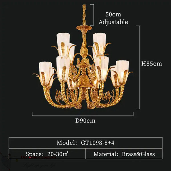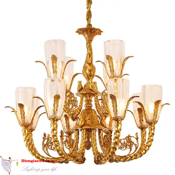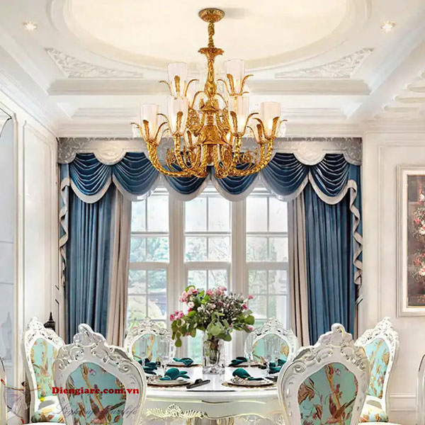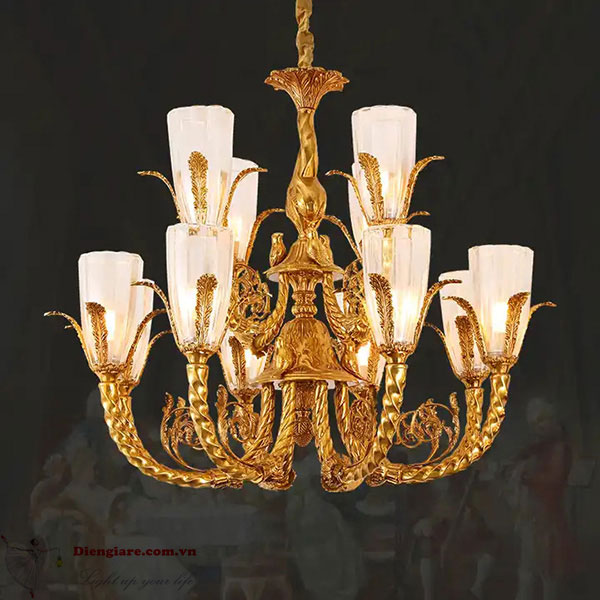 Khung đèn: Được làm từ chất liệu đồng, khung đèn có thiết kế phức tạp và tỉ mỉ, tạo nên vẻ đẹp cổ điển và sự chắc chắn cho đèn chùm.